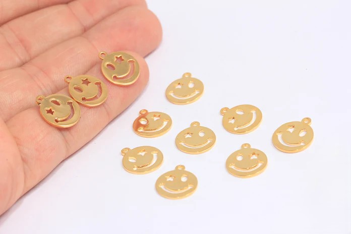 Shiny Gold Plated Smiling Face Smiley Emoji Necklace Pendant Smiling Face Pendant Bracelet Bangle Pendant Dimensions: 12 mm Price is per piece. 24 carat gold plated on brass. A Quality product resistant to rust and tarnishing. Do not contact with chemicals and perfumes for long-term use. Passed all tests does not contain harmful materials. Colors may vary depending on screen settings and ambient light.