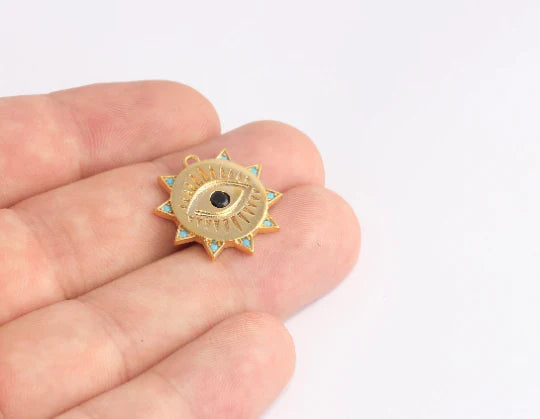 24K Gold Plated Turquoise Black Zircon Stone Shiny Sun Charm Sun Pendant. Dimensions: 21mm Price is per piece. 24K gold plated on brass. A Quality product resistant to rust and tarnishing. Do not contact with chemicals and perfumes for long-term use. Passed all tests does not contain harmful materials. Colors may vary depending on screen settings and ambient light.