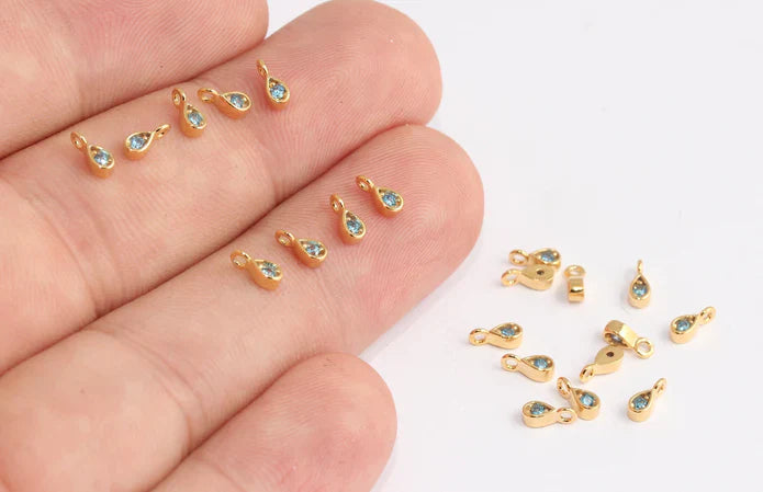 24 Carat Gold Plated Turquoise Zircon Stone Drop Charms Drop Pendant. Dimensions: 2.5x6mm Price is per piece. 24 carat gold plated on brass. A Quality product does not rust or tarnish. Do not contact with chemicals and perfumes for long-term use. Passed all tests does not contain harmful materials. Colors may vary depending on screen settings and ambient light.