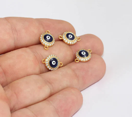 24K Gold Plated White Blue Zircon Stone Shiny Round Evil Eye Charms Round Evil Eye Pendant. Dimensions: 10x15mm Price is per piece. 24K gold plated on brass. A Quality product does not rust or tarnish. Do not contact with chemicals and perfumes for long-term use. Passed all tests does not contain harmful materials. Colors may vary depending on screen settings and ambient light.