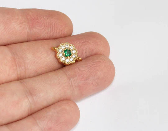 24K Gold Plated White Green Zircon Stone Shiny Flower Charms Flower Pendant. Dimensions: 11x17mm Price is per piece. 24K gold plated on brass. A Quality product resistant to rust and tarnishing. Do not contact with chemicals and perfumes for long-term use. Passed all tests does not contain harmful materials. Colors may vary depending on screen settings and ambient light.