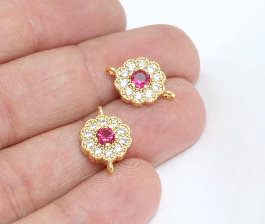 24K Gold Plated White Ruby Zircon Stone Shiny Flower Charm Flower Pendant. Dimensions: 11x17mm Price is per piece. 24K gold plated on brass. A Quality product resistant to rust and tarnishing. Do not contact with chemicals and perfumes for long-term use. Passed all tests does not contain harmful materials. Colors may vary depending on screen settings and ambient light.