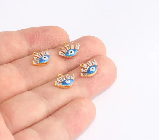 24 Carat Gold Plated White Zircon Stone Blue Enamel Shiny Eye Charms Eye Pendant. Dimensions: 10x13mm Price is per piece. 24 carat gold plated on brass. A Quality product does not rust or tarnish. Do not contact with chemicals and perfumes for long-term use. Passed all tests does not contain harmful materials. Colors may vary depending on screen settings and ambient light.