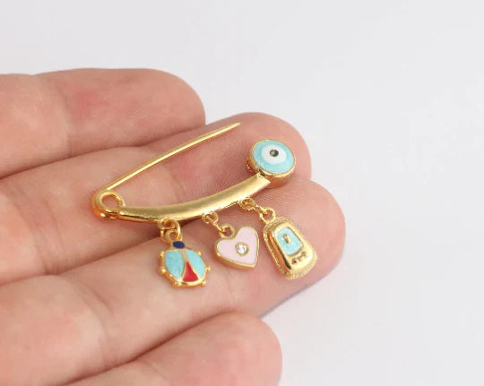 24 Carat Gold Plated White Zircon Stone Blue Safety Pin Dangle Bronchus Safety Pin Dangle Brooch. Dimensions: 25x35mm Price is per piece. 24 carat gold plated on brass. A Quality product resistant to rust and tarnishing. Do not contact with chemicals and perfumes for long-term use. Passed all tests does not contain harmful materials. Colors may vary depending on screen settings and ambient light.