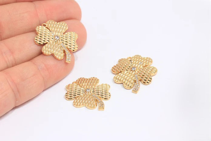 24K Gold Plated White Zircon Stone Shiny Clover Charms Clover Pendant. Dimensions: 22x25mm Price is per piece. 24K gold plated on brass. A Quality product resistant to rust and tarnishing. Do not contact with chemicals and perfumes for long-term use. Passed all tests does not contain harmful materials. Colors may vary depending on screen settings and ambient light.