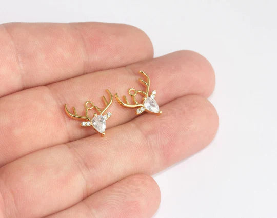 24K Gold Plated White Zircon Stone Shiny Deer Charms Deer Pendant. Dimensions: 14x16mm Price is per piece. 24K gold plated on brass. A Quality product does not rust or tarnish. Do not contact with chemicals and perfumes for long-term use. Passed all tests does not contain harmful materials. Colors may vary depending on screen settings and ambient light.