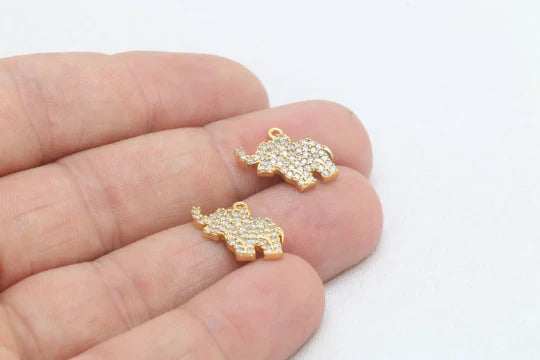 24 Carat Gold Plated White Zircon Stone Shiny Elephant Charm Elephant Pendant. Dimensions: 13x18mm Price is per piece. 24 carat gold plated on brass. A Quality product resistant to rust and tarnishing. Do not contact with chemicals and perfumes for long-term use. Passed all tests does not contain harmful materials. Colors may vary depending on screen settings and ambient light.