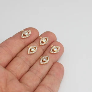 24 Carat Gold Plated White Zircon Stone Shiny Eye Charms Eye Pendant. Dimensions: 10x14mm Price is per piece. 24 carat gold plated on brass. A Quality product does not rust or tarnish. Do not contact with chemicals and perfumes for long-term use. Passed all tests does not contain harmful materials. Colors may vary depending on screen settings and ambient light.