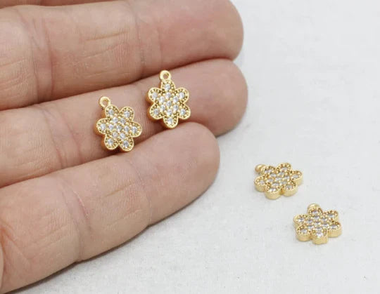 24K Gold Plated White Zircon Stone Shiny Flower Charms Flower Pendant. Dimensions: 9x12mm Price is per piece. 24K gold plated on brass. A Quality product does not rust or tarnish. Do not contact with chemicals and perfumes for long-term use. Passed all tests does not contain harmful materials. Colors may vary depending on screen settings and ambient light.