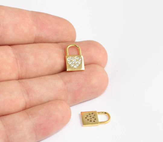 24K Gold Plated White Zircon Stone Shiny Heart Lock Charms Heart Lock Pendant. Dimensions: 10x16mm Price is per piece. 24K gold plated on brass. A Quality product does not rust or tarnish. Do not contact with chemicals and perfumes for long-term use. Passed all tests does not contain harmful materials. Colors may vary depending on screen settings and ambient light.