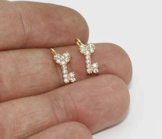 24K Gold Plated White Zircon Stone Shiny Key Charms Key Pendant. Dimensions: 6x13mm Price is per piece. 24K gold plated on brass. A Quality product does not rust or tarnish. Do not contact with chemicals and perfumes for long-term use. Passed all tests does not contain harmful materials. Colors may vary depending on screen settings and ambient light.
