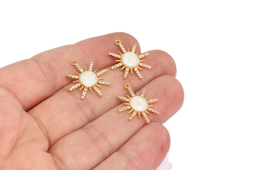 24K Gold Plated White Zircon Stone Mother-of-Pearl Enamel Shiny Sun Charms Sun Pendant. Dimensions: 19x21mm Price is per piece. 24K gold plated on brass. A Quality product resistant to rust and tarnishing. Do not contact with chemicals and perfumes for long-term use. Passed all tests does not contain harmful materials. Colors may vary depending on screen settings and ambient light.