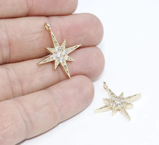 24K Gold Plated White Zircon Stone Shiny North Star Charms North Star Pendant. Dimensions: 24x28mm Price is per piece. 24K gold plated on brass. A Quality product resistant to rust and tarnishing. Do not contact with chemicals and perfumes for long-term use. Passed all tests does not contain harmful materials. Colors may vary depending on screen settings and ambient light.