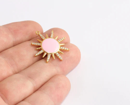 24K Gold Plated White Zircon Stone Shiny Pink Enamel Stone Sun Charms Sun Pendant. Dimensions: 26x28mm Price is per piece. 24K gold plated on brass. A Quality product resistant to rust and tarnishing. Do not contact with chemicals and perfumes for long-term use. Passed all tests does not contain harmful materials. Colors may vary depending on screen settings and ambient light.
