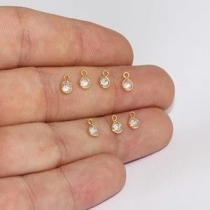 24 Carat Gold Plated White Zircon Stone Shiny Round Charms Round Pendant. Dimensions: 5x7mm Price is per piece. 24 carat gold plated on brass. A Quality product does not rust or tarnish. Do not contact with chemicals and perfumes for long-term use. Passed all tests does not contain harmful materials. Colors may vary depending on screen settings and ambient light.