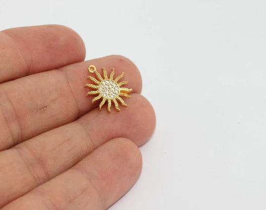 24 Carat Gold Plated White Zircon Stone Shiny Sun Charms Sun Pendant. Dimensions: 15x17mm Price is per piece. 24 carat gold plated on brass. A Quality product does not rust or tarnish. Do not contact with chemicals and perfumes for long-term use. Passed all tests does not contain harmful materials. Colors may vary depending on screen settings and ambient light.