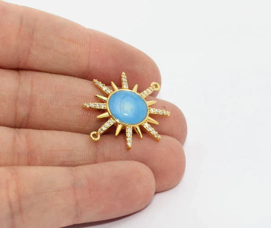 24 carat gold plated double handle white zircon stone bright turquoise enamel stone sun charms sun pendant. Dimensions: 26x30mm Price is per piece. 24 carat gold plated on brass. A quality product resistant to rust and tarnishing. Do not contact with chemicals and perfumes for long-term use. Passed all tests does not contain harmful materials. Colors may vary depending on screen settings and ambient light.