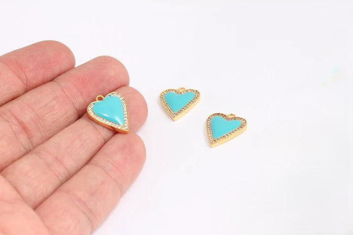 24K Gold Plated White Zircon Stone Turquoise Heart Charms Heart Pendant. Dimensions: 15x18mm Price is per piece. 24K gold plated on brass. A Quality product resistant to rust and tarnishing. Do not contact with chemicals and perfumes for long-term use. Passed all tests does not contain harmful materials. Colors may vary depending on screen settings and ambient light.