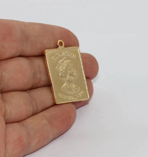 24K Shiny Gold Plated Queen Elizabeth Pendant Embossed Rectangular Medallion. Dimensions: 23x33mm Price is per piece. 24K gold plated on brass. A Quality product resistant to rust and tarnishing. Do not contact with chemicals and perfumes for long-term use. Passed all tests does not contain harmful materials. Colors may vary depending on screen settings and ambient light.