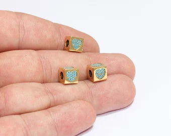 24 Carat Shiny Gold Plated Blue Zircon Stone Cube Intermediate Material Dimensions: 8x8 mm Price is per piece. 24 Carat gold plated on brass. A Quality product resistant to rust and tarnishing. Do not contact with chemicals and perfumes for long-term use. Passed all tests does not contain harmful materials. Colors may vary depending on screen settings and ambient light.