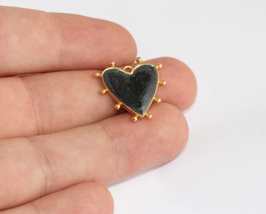 24 Carat Shiny Gold Plated Black Enameled Heart Pendant Heart Charm Dimensions: 21mm Price is per piece. 24 carat gold plated on brass. A Quality product resistant to rust and tarnishing. For long-term use do not contact with chemicals and perfumes. Passed all tests does not contain harmful materials. Colors may vary depending on screen settings and ambient light.