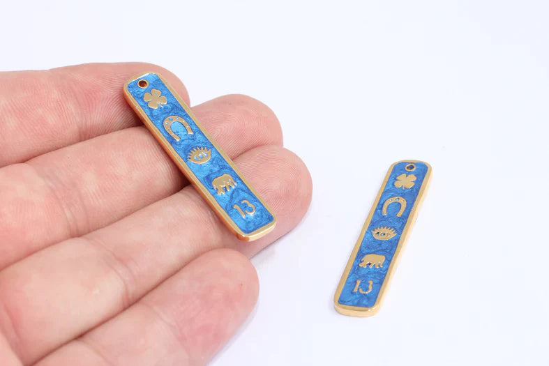 24 Carat Shiny Gold Plated Blue Color Enameled Multi Lucky Bar Lucky Charm. Dimensions: 8x44mm Price is per piece. 24 carat gold plated on brass. A Quality product resistant to rust and tarnishing. Do not contact with chemicals and perfumes for long-term use. Passed all tests does not contain harmful materials. Colors may vary depending on screen settings and ambient light.