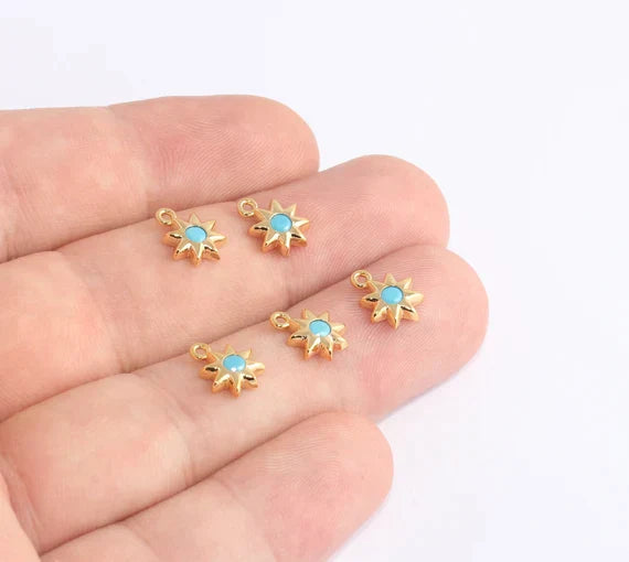 Shiny Gold Plated Star Pendant blue micro pave Dimensions: 8.5x11mm. Package price. There are 5 products in 1 package. 24 carat gold plated on brass. A Quality product resistant to rust and tarnishing. Do not contact with chemicals and perfumes for long-term use. Passed all tests does not contain harmful materials. Colors may vary depending on screen settings and ambient light.