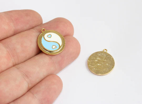 24K Shiny Gold Plated Blue White Enameled Yin Yang Pendant. Dimensions: 19x22mm Price is per piece. 24K gold plated on brass. A Quality product resistant to rust and tarnishing. Do not contact with chemicals and perfumes for long-term use. Passed all tests does not contain harmful materials. Colors may vary depending on screen settings and ambient light.