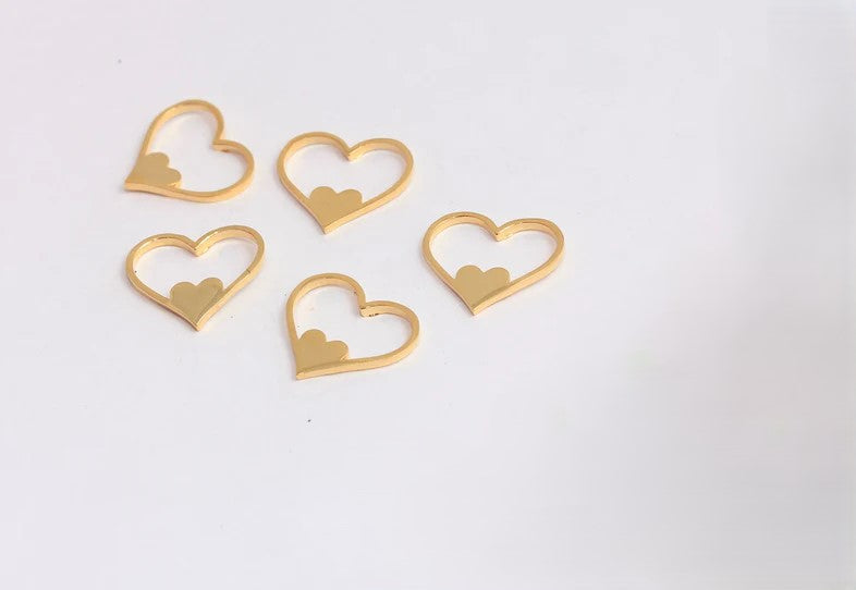 24 Carat Shiny Gold Plated Frame Heart-in-Heart Charm Connection Apparatus. Dimensions: 14x16mm Price is per piece. 24 carat gold plated on brass. A Quality product resistant to rust and tarnishing. Do not contact with chemicals and perfumes for long-term use. Passed all tests does not contain harmful materials. Colors may vary depending on screen settings and ambient light.