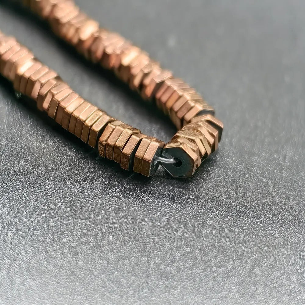 4 mm Copper Color Threaded Cut Hematite Natural Stone.Dimensions: 3 mm x 1 mm.Sold in strands.Each strand contains approximately 430 hematite stones.It is a natural hematite stone.Hematite is a shiny natural stone with a metallic appearance, believed to affect the root chakra.It is thought to provide energy, courage, and joy to the user while relieving stress.Hematite stones can be used in the design of bracelets, necklaces, and earrings.