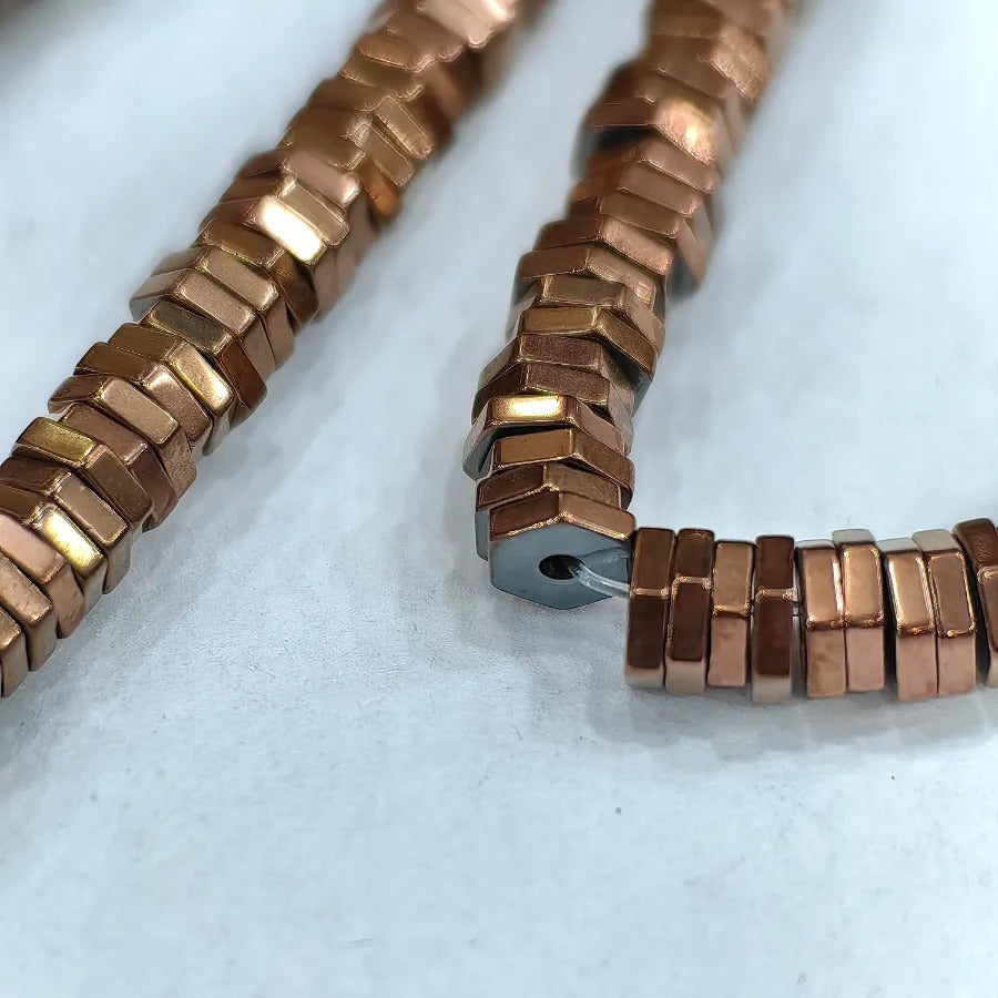 4 mm Copper Color Threaded Cut Hematite Natural Stone.Dimensions: 4 mm x 1 mm.Sold in strands.Each strand contains approximately 370 hematite stones.It is a natural hematite stone.Hematite is a shiny natural stone with a metallic appearance, believed to affect the root chakra.It is thought to provide energy, courage, and joy to the user while relieving stress.Hematite stones can be used in the design of bracelets, necklaces, and earrings.