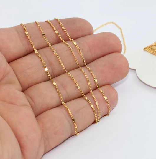 24 Carat Gold Plated Sequined Chain. Dimensions: 1.5 mm PRICE FOR 1 METER. 24 Carat gold plated on brass. A Quality product resistant to rust and tarnishing. Do not contact with chemicals and perfumes for long-term use. Passed all tests does not contain harmful materials. Colors may vary depending on screen settings and ambient light.