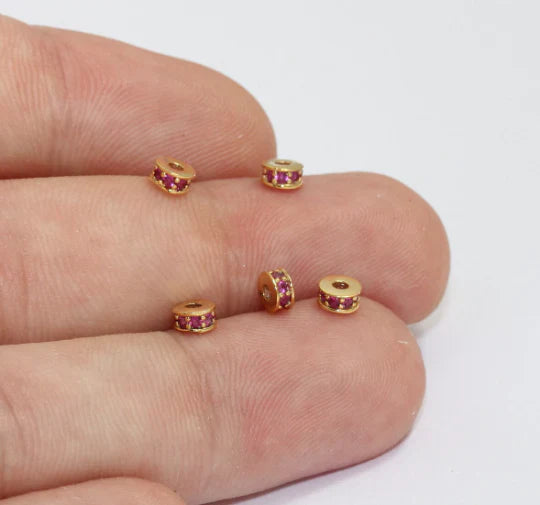 24 Carat Gold Plated Purple Zircon Stone Shiny Round Bead Atra. Dimensions: 2.5x4.5 mm. Price for 5 pieces. 24 carat gold plated on brass. A Quality product, does not rust or tarnish. Do not contact with chemicals and perfumes for long-term use. Passed all tests, does not contain harmful materials. Colors may vary depending on screen settings and ambient light.