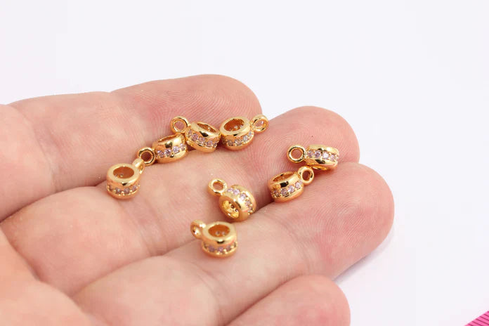 24 Carat Gold Plated White Zircon Stone Shiny Round Swing Device, Handle. Dimensions: 6.5x10mm Price for 5 Pieces. 24 Carat gold plated on brass. A Quality product, does not rust or tarnish. Do not contact with chemicals and perfumes for long-term use. Passed all tests, does not contain harmful materials. Colors may vary depending on screen settings and ambient light.