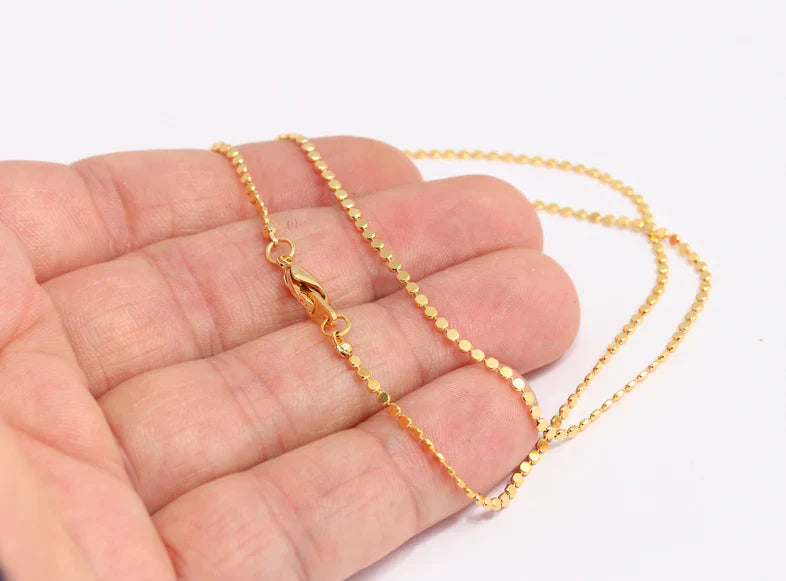 24 Carat Gold Plated Shiny, 40cm, Round Crushed Disc Ready Chain. Dimensions: 1.6mm Price is per piece. 24 carat gold plated on brass. A Quality product, resistant to rust and tarnishing. Do not contact with chemicals and perfumes for long-term use. Passed all tests, does not contain harmful materials. Colors may vary depending on screen settings and ambient light.
