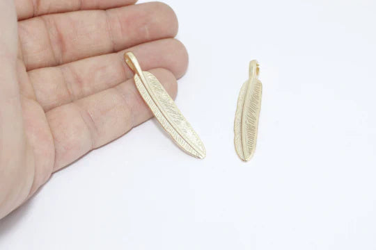 24 Carat Matte Gold Plated Feather Pendant. Dimensions: 10x54mm Price is per piece. 24 carat gold plated on brass. A Quality product resistant to rust and tarnishing. Do not contact with chemicals and perfumes for long-term use. Passed all tests does not contain harmful materials. Colors may vary depending on screen settings and ambient light.