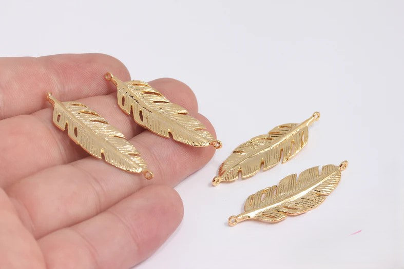 24 Carat Shiny Gold Plated Double Hole Feather Necklace and Bracelet Pendant. Dimensions: 14x43mm Price is per piece. 24 Carat gold plated on brass. A Quality product resistant to rust and tarnishing. Do not contact with chemicals and perfumes for long-term use. Passed all tests does not contain harmful materials. Colors may vary depending on screen settings and ambient light.