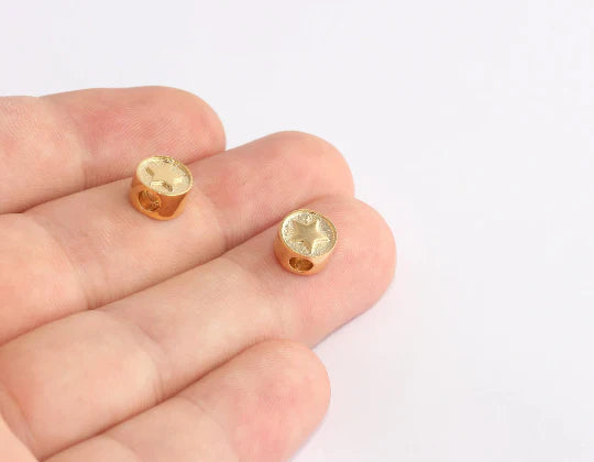 24 carat bright gold plated embossed star motif round pendant bangle bracelet pendant. Hole diameter: 2.5 mm Dimensions: 9 mm. Package price. There are 5 products in 1 package. 24 carat gold plated brass. A quality product resistant to rust and tarnishing. Do not contact with chemicals and perfumes for long-term use. Passed all tests does not contain harmful materials. Colors may vary depending on screen settings and ambient light.