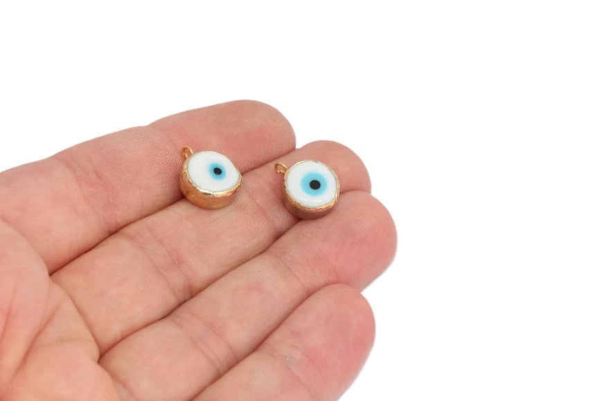 24 Carat Shiny Gold Plated Evil Eye Bead Necklace Pendant Bracelet Dangle. Dimensions: 11x14mm Price is per piece. 24 carat gold plated on brass. A Quality product resistant to rust and tarnishing. Do not contact with chemicals and perfumes for long-term use. Passed all tests does not contain harmful materials. Colors may vary depending on screen settings and ambient light.