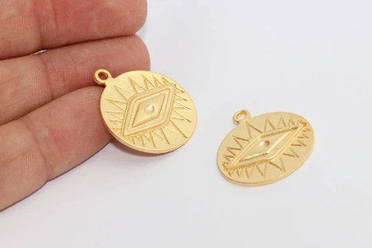 24 Carat Shiny Gold Plated Evil Eye Pendant. Dimensions: 24x28mm Price is per piece. 24 carat gold plated on brass. A Quality product resistant to rust and tarnishing. Do not contact with chemicals and perfumes for long-term use. Passed all tests does not contain harmful materials. Colors may vary depending on screen settings and ambient light.