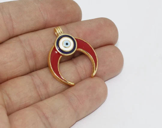 24 Carat Shiny Gold Plated Red Enameled Crescent Evil Eye Bead. Dimensions: 26x31mm Price is per piece. 24 carat gold plated on brass. A Quality product resistant to rust and tarnishing. For long-term use do not contact with chemicals and perfumes. Passed all tests does not contain harmful materials. Colors may vary depending on screen settings and ambient light.