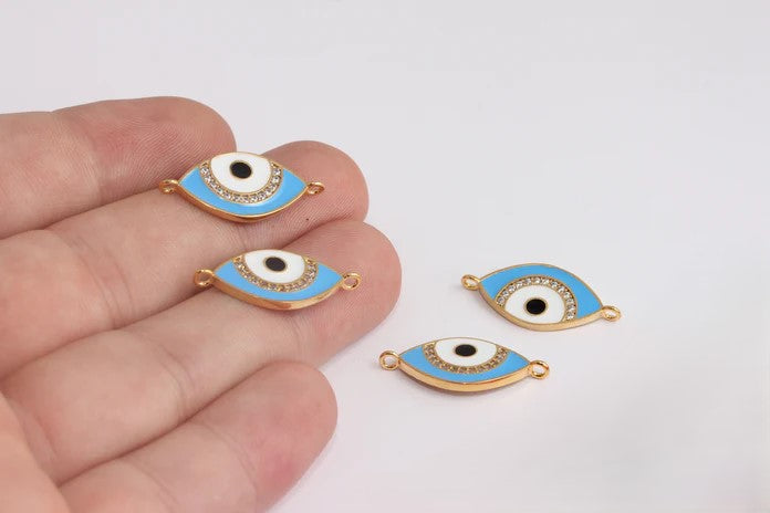 24K Shiny Gold Plated Zircon Stone Blue Double Handle Eye Evil Eye Necklace Pendant Bracelet Spacer. Dimensions: 12x26mm Price is per piece. 24K gold plated on brass. A Quality product resistant to rust and tarnishing. Do not contact with chemicals and perfumes for long-term use. Passed all tests does not contain harmful materials. Colors may vary depending on screen settings and ambient light.