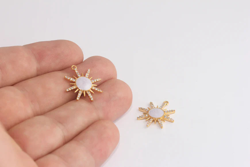 24 Carat Shiny Gold Plated Zircon Stone Middle White Pearl Sun Necklace Dimensions: 19x21 mm Price is per piece. 24 carat gold plated on brass. A Quality product resistant to rust and tarnishing. Do not contact with chemicals and perfumes for long-term use. Passed all tests does not contain harmful materials. Colors may vary depending on screen settings and ambient light.