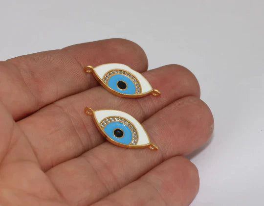 24 carat bright gold plated zircon stone white blue double handle evil eye necklace pendant bracelet spacer. Dimensions: 12x26mm Price is per piece. 24 carat gold plated on brass. A quality product resistant to rust and tarnishing. Do not contact with chemicals and perfumes for long-term use. Passed all tests does not contain harmful materials. Colors may vary depending on screen settings and ambient light.