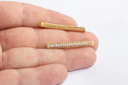 24 Gold Gold Plated White Zircon Stone Shiny Pipe Jewelry Piece. Dimensions: 4x40mm Price is per piece. 24 carat gold plated on brass. A Quality product resistant to rust and tarnishing. Do not contact with chemicals and perfumes for long-term use. Passed all tests does not contain harmful materials. Colors may vary depending on screen settings and ambient light.