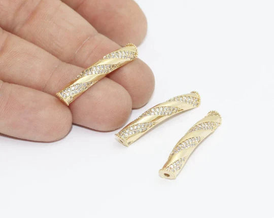 24 Gold Gold Plated White Zircon Stone Twisted Shiny Pipe Jewelry Piece. Dimensions: 6x33mm Price is per piece. 24 carat gold plated on brass. A Quality product resistant to rust and tarnishing. Do not contact with chemicals and perfumes for long-term use. Passed all tests does not contain harmful materials. Colors may vary depending on screen settings and ambient light.