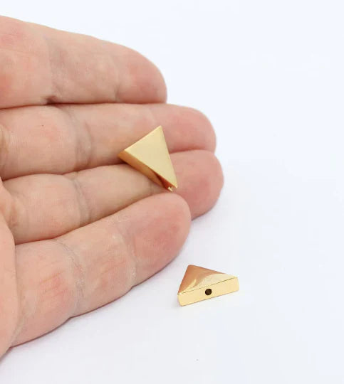 24K Shiny Gold Triangle Charm Triangle Pendant Hal Hal Bracelet Spacer Bead Geometric. Hole Diameter: 1.5mm Dimensions: 14mm. Package price. There are 5 products in 1 package. 24K gold plated on brass. A Quality product resistant to rust and tarnishing. Do not contact with chemicals and perfumes for long-term use. Passed all tests does not contain materials harmful to health. Colors may vary depending on screen settings and ambient light.