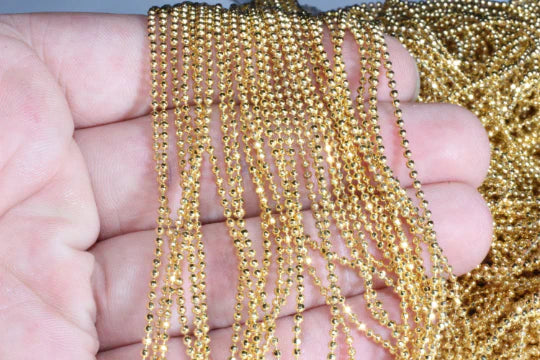 24 Carat Gold Plated Ball Chain. Dimensions: 1.2 mm PRICE FOR 1 METER. 24 Carat gold plated on brass. A Quality product resistant to rust and tarnishing. Do not contact with chemicals and perfumes for long-term use. Passed all tests does not contain harmful materials. Colors may vary depending on screen settings and ambient light.