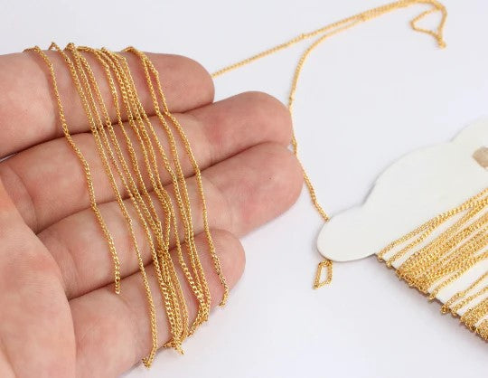 24 Carat Gold Plated Thin Cable Chain. Dimensions: 1.2 mm PRICE FOR 1 METER. 24 Carat gold plated on brass. A Quality product resistant to rust and tarnishing. Do not contact with chemicals and perfumes for long-term use. Passed all tests does not contain harmful materials. Colors may vary depending on screen settings and ambient light.