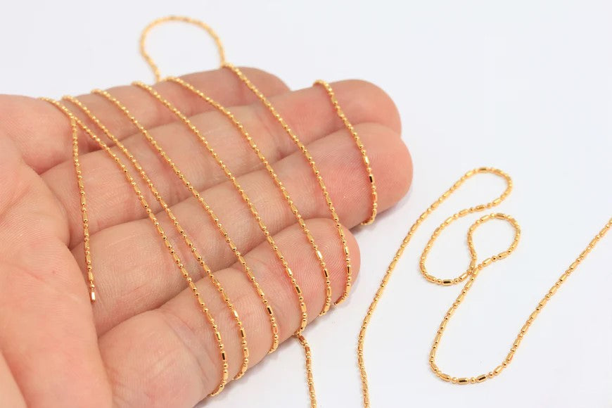 24 Carat Gold Plated Soldered Ball and Cylinder Chain. Dimensions: 1 mm PRICE FOR 1 METER. 24 Carat gold plated on brass. A Quality product resistant to rust and tarnishing. Do not contact with chemicals and perfumes for long-term use. Passed all tests does not contain harmful materials. Colors may vary depending on screen settings and ambient light.